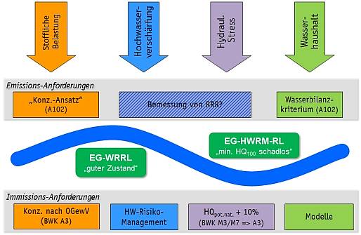Die Wasserrahmenrichtlinie fordert von den Mitgliedstaaten dafür zu sorgen, dass Einleitungen in Oberflächengewässer mit einem "kombinierten Ansatz" mit Immissions- und Emissionskriterien begrenzt werden (Artikel 10 WRRL). Die Immissionskriterien werden dabei mit der EG-WRRL definiert, die Emissionskriterien sollen dagegen aus nationalen Vorschriften (z.B. der Abwasserverordnung) bzw. anderen EU-Richtlinien (z.B. Kommunalabwasserrichtlinie) resultieren. Dabei ist zu berücksichtigen, dass sie Gewässerbelastungen durch Niederschlagswassereinleitungen eben nicht nur in stofflicher Hinsicht sondern auch in quantitativer Hinsicht ergeben (s. Grafik).