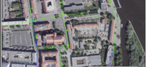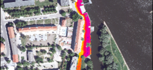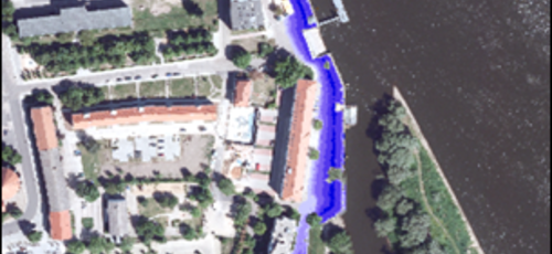 Die Auswertung des gleichzeitigen Zusammentreffens von Oderhochwasser und Starkniederschlag ergibt eine statistische Wahrscheinlichkeit von ca. einmal in 125 Jahren, dass bei einem Oderhochwasser größer Alarmstufe 2 eine Niederschlagsjährlichkeit T=0,5 auftritt. Daher wurde diese Jährlichkeit als maßgebend festgelegt. Die Straßeneinläufe der Uferstraße und des Holzmarktes sind bei einem Niederschlagsereignis wenig abflusswirksam und stauen kurzfristig über. Der maßgebliche Zufluss bei Überstau generiert sich am Auslass der Logenstraße und verteilt sich aufgrund des Gefälles auch auf die Bereiche Uferstraße und Holzmarkt (Abb. 2). Das höchste Schadenspotenzial ergibt sich durch die betroffenen Gebäude. Bei einer Jährlichkeit von T=0,5 und einer Dauerstufe von 45 Minuten ergibt sich bereits ein erhebliches Schadenspotenzial.