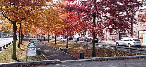 In Planstraße B und C West ist eine Entwässerung über Mulden-Rigolen vorgesehen. Wie auch bei den Tiefbeet- und Baumrigolen wird der Oberflächenabfluss in den Mulden-Rigolen zurückgehalten und der Anteil, der nicht versickert oder verdunstet über Drosselschächte stark verzögert in Richtung der Retentionsmulden abgeleitet.
