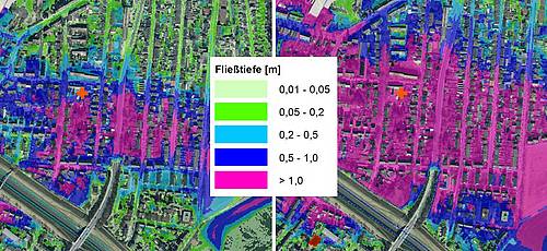 Die Ergebnisse der Fließwegeanalyse und der 2D Oberflächenabflussmodellierung sind darüber hinaus in das Kooperationsmodul ZUGABE direkt einlesbar. Fließwege, Senken, Ursprungsgebiete, maximale Wassertiefen und Fließgeschwindigkeiten können in ZUGABE als wichtige Parameter zur Identifizierung von Schwachstellen bzw. von Abkopplungspotentialen genutzt werden.